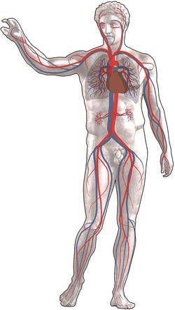 Arteriën (in het rood) voeren zuurstofrijk bloed van het hart naar de weefsels, de venen (blauw) voeren zuurstofarm bloed terug van de weefsels naar het hart.